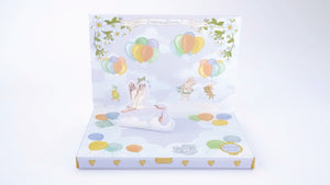 Open the Music Box Card to reveal a beautifully adorable, musical storytelling scene. Listen to the music and watch the baby and stalk magically float around and around to a classical lullaby.