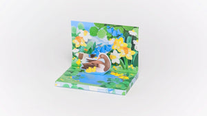 Open the Music Box Card to reveal a beautiful musical storytelling scene. Listen to the music and watch the mother duck and her ducklings float around and around in the pond amongst the daffodils.