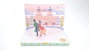 Open the Music Box Card to reveal a beautifully festive, musical storytelling scene. Listen to the music and watch the couple magically skate around and around to a classic Christmas tune.