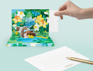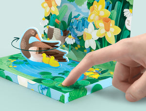 Open the Music Box Card to reveal a beautiful musical storytelling scene. Listen to the music and watch the mother duck and her ducklings float around and around in the pond amongst the daffodils.