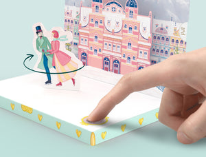 Open the Music Box Card to reveal a beautifully festive, musical storytelling scene. Listen to the music and watch the couple magically skate around and around to a classic Christmas tune.