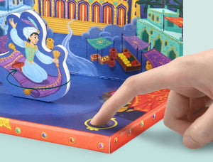 Open the Music Box Card to reveal a beautiful musical storytelling scene. Listen to the music and watch Aladdin on his carpet magically fly around and around to the music.