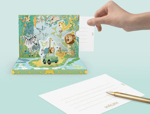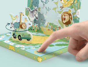 Open the Music Box Card to reveal a beautiful musical storytelling scene. Listen to the music and watch the safari jeep magically drive around and around to the jungle music.