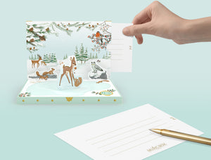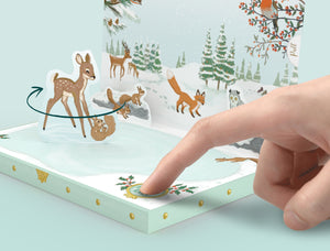 Open the Music Box Card to reveal a beautifully festive, musical storytelling scene. Listen to the music and watch the woodland animals skate around and around to an enchanted tune.