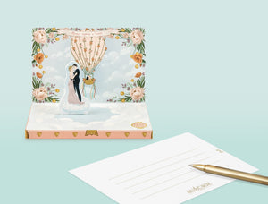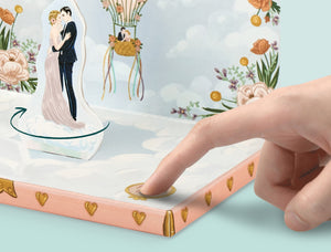 Open the Music Box Card to reveal a beautiful Wedding storytelling scene. Listen to the music and watch the happy couple magically glide around and around to the wedding music.