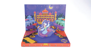 Open the Music Box Card to reveal a beautiful musical storytelling scene. Listen to the music and watch Aladdin on his carpet magically fly around and around to the music.